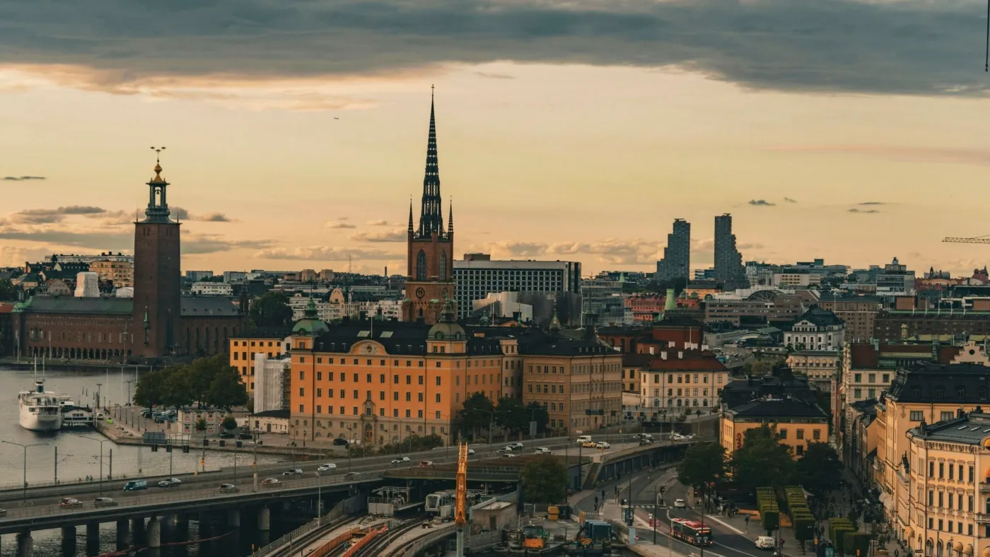 A spectacular view of Stockholm from the water with tones of red on the sky